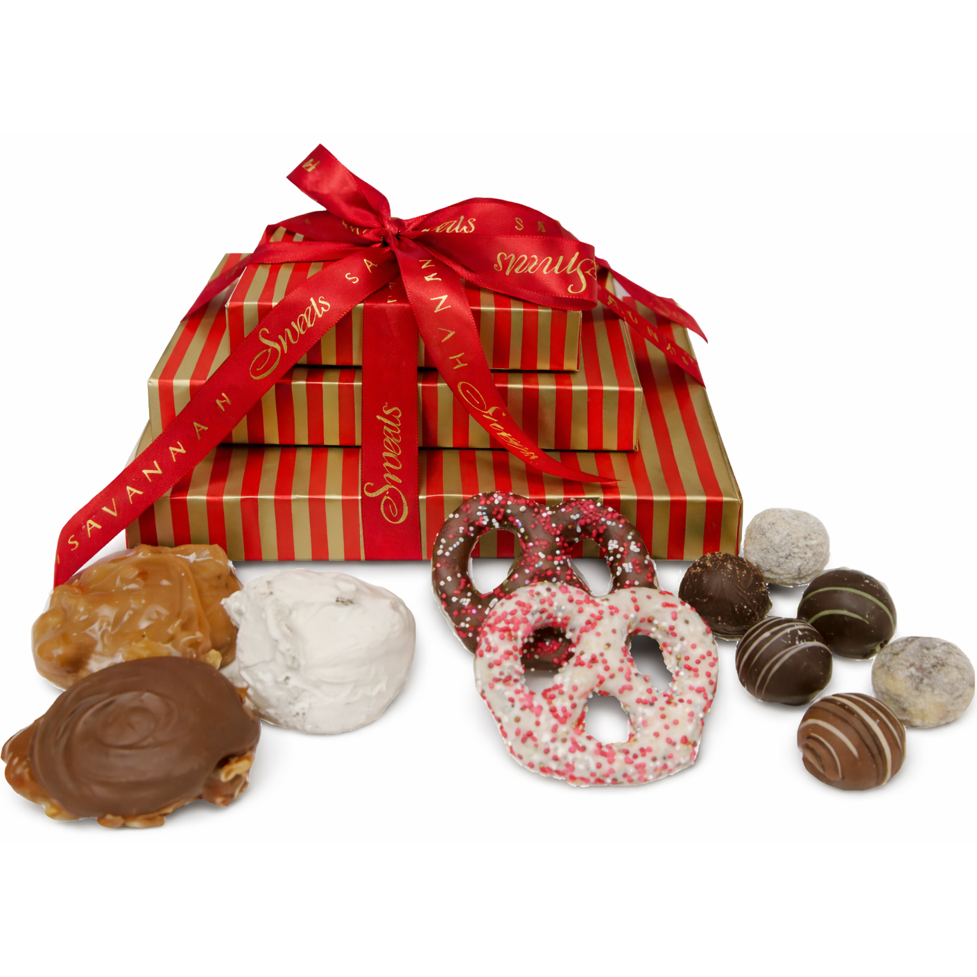 This 3 box tower contains Traditional Pralines, Milk Chocolate Paws and Divinity on the bottom tower. Valentine Milk and Pearl White Chocolate Pretzels in the middle box and topped off with a 6 piece assorted Truffle box.